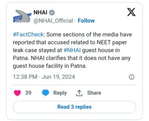 प्रेस के कुछ वर्गों में यह बताया गया है कि नीट (एनईईटी) पेपर लीक मामले से संबंधित आरोपी पटना में भारतीय राष्ट्रीय राजमार्ग प्राधिकरण (एनएचएआई) के गेस्ट हाउस में रुके थे। एनएचएआई यह स्पष्ट करना चाहता है कि एनएचएआई के पास पटना में कोई गेस्ट हाउस की सुविधा नहीं है। तदनुसार, मीडिया से यह अनुरोध किया जाता है कि वह इस तथ्य पर ध्यान दे और यदि पहले कोई गलत रिपोर्ट जारी की जा चुकी है तो उसे सही करे।