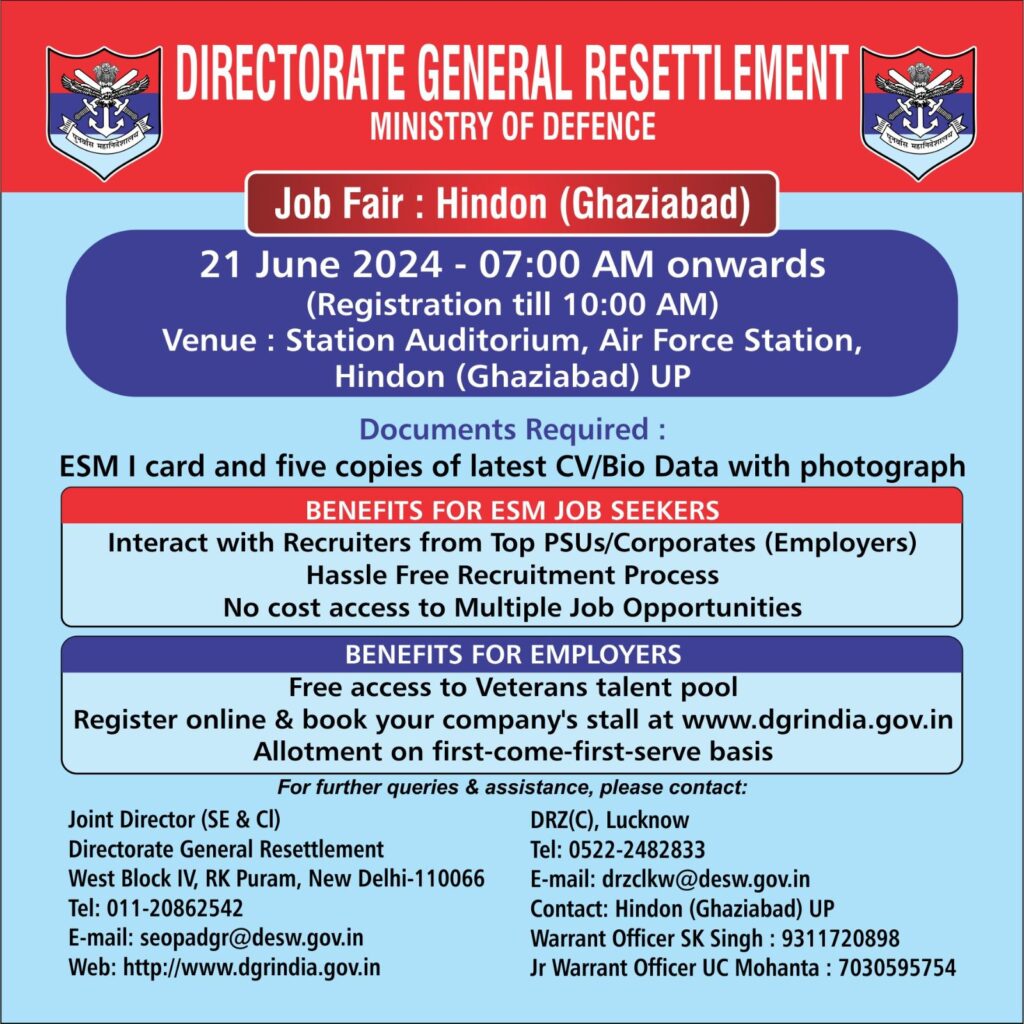 रक्षा मंत्रालय का पुनर्वास महानिदेशालय – डीजीआर 21 जून, 2024 को उत्तर प्रदेश के हिंडन (गाजियाबाद) स्थित वायुसेना स्टेशन के ऑडिटोरियम में पूर्व सैनिक रोजगार मेले का आयोजन कर रहा है। इसका उद्देश्य पूर्व सैनिकों और नियोक्ताओं को जोड़ना है, ताकि पूर्व सैनिकों (ईएसएम) को रोजगार का दूसरा अवसर मिल सके। देश भर से तीनों सेनाओं के पूर्व सैनिक इस रोजगार मेले में भाग ले सकते हैं। मेले में लगभग 40 कॉरपोरेट कंपनियों के भाग लेने की उम्मीद है जो पूर्व सैनिकों को फील्ड जॉब, प्रशासनिक कार्य, डेस्क जॉब, संस्थागत सुरक्षा और संबंधित कार्यों जैसी विभिन्न नौकरियों की पेशकश करेंगे।