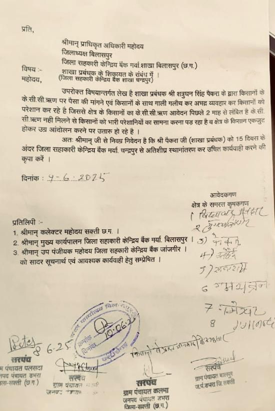 ग्राम पंचायत पलसदा (विकासखंड डभरा, जिला शक्ति) के सरपंच एवं जनप्रतिनिधियों ने दिनांक 10 जून 2025 को बैंक के प्राधिकृत अधिकारी को पत्र सौंपा है, जिसमें लिखा गया है कि शंभूनाथ सिंह वैश्य द्वारा सीसी ऋण (Cash Credit Loan) की मांग को लेकर आने वाले किसानों से दुर्व्यवहार किया जाता है। उन्हें घंटों बैंक में बिठाकर रखा जाता है, गाली-गलौज की जाती है और बार-बार बहाने बनाकर परेशान किया जाता है। इतना ही नहीं, बैंक शाखा में मूलभूत सुविधाओं की भी भारी कमी है।