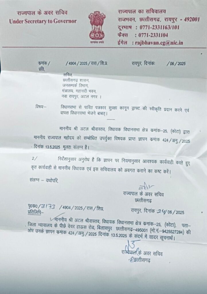 राज्यपाल ने पत्रकार सुरक्षा कानून पर छत्तीसगढ़ शासन को लिखा पत्र, विधायक अटल श्रीवास्तव के आग्रह पर की कार्रवाई