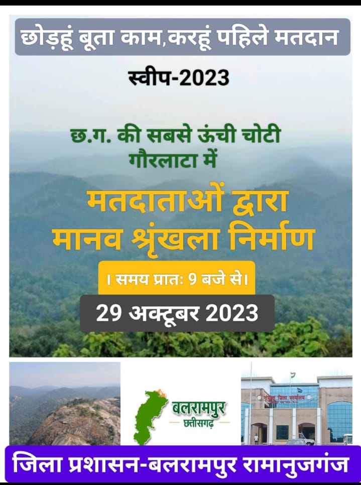 आपको बता दे की छत्तीसगढ़ की सबसे ऊंची चोटी गौर लाटा मगाजी पहाड़ पर स्थित है। आज कलेक्टर रिमिजियुस एक्का की अध्यक्षता में एसपी डॉक्टर लाल उम्मेद सिंह, एवं एडिशनल एसपी चंद्रेश ठाकुर, एवं सभी तहसीलदार, शशिकांत दुबे, अपर कलेक्टर, पैकरा साहब, सभी ग्राम पंचायतों के सरपंच सचिव सभी जंगल के।पकडंडी रास्ते से सभी।पैदल चलकर छत्तीसगढ़ की सबसे ऊंची चोटी गौर लाटा पहाड़ पर चढ़े, और सभी लोगों को वोटिंग मतदाता जागरूकता का अभियान चलाया, लोगों को वोटिंग करने की उत्सुकता जगाई गई सभी 18 की आयु वाले को बोटिंग की समझाइश दी गई।
