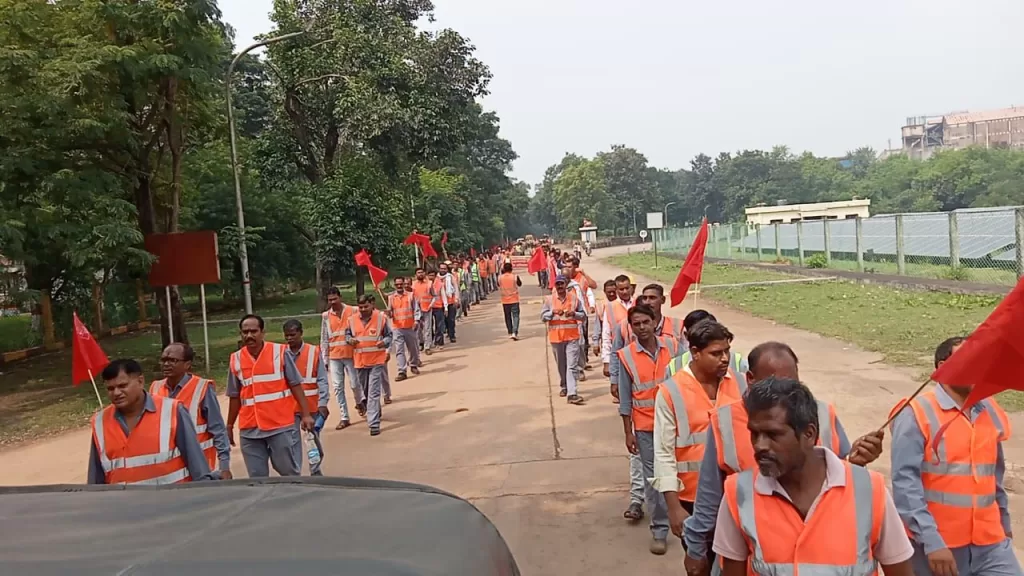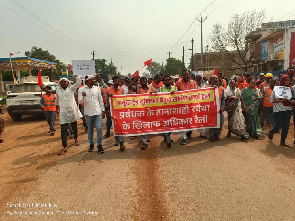 अल्ट्राटेक बैकुंठ सीमेंट वर्क्स के मजदूरों ने SDM तिल्दा तक निकाली विशाल जंगी पैदल रैली