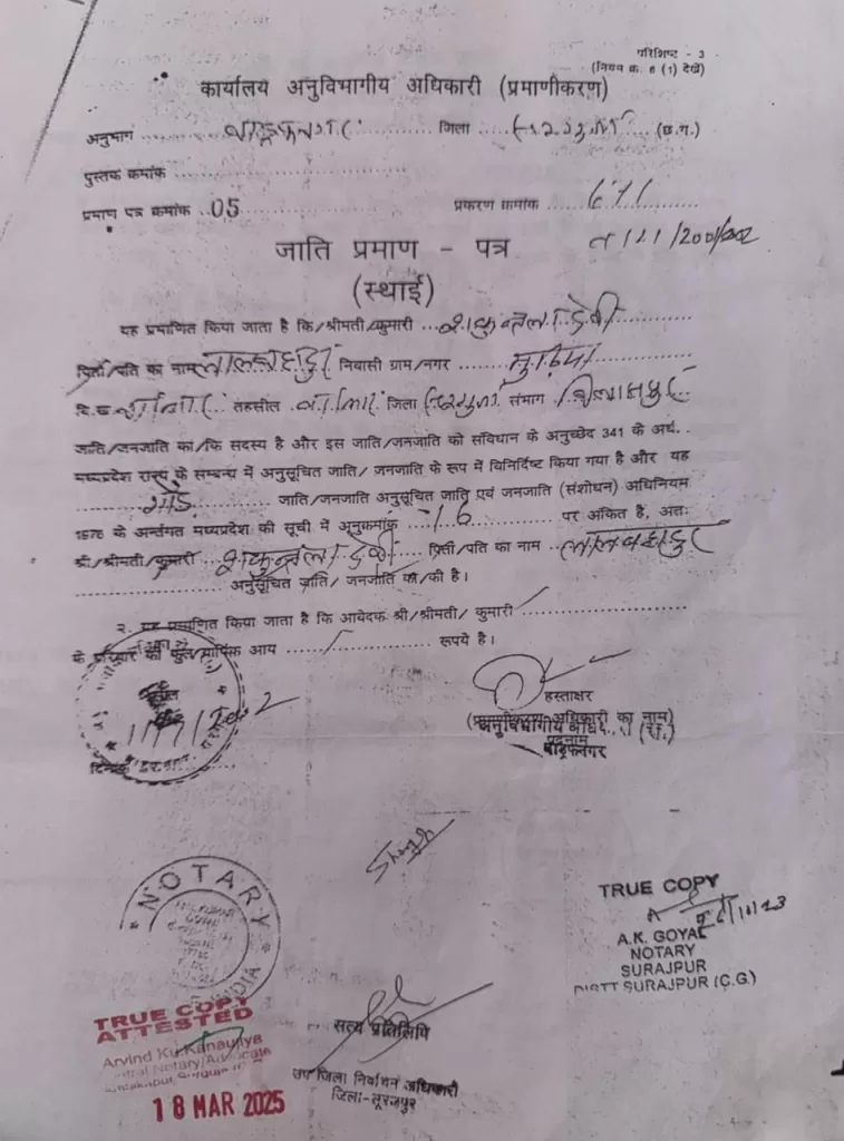 आरोप बेहद गंभीर — फर्जी जाति प्रमाण पत्र।