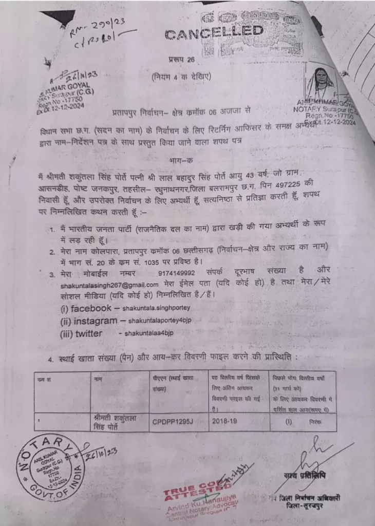 प्रतापपुर विधानसभा की भाजपा विधायक शकुंतला सिंह पोर्ते एक बार फिर विवादों के केंद्र में हैं। इस बार मामला बेहद गंभीर है — फर्जी जाति प्रमाण पत्र का आरोप, और यह आरोप लगाया है प्रदेश के वरिष्ठ आदिवासी नेता एवं पूर्व शिक्षा मंत्री डॉ. प्रेमसाय सिंह टेकाम ने।