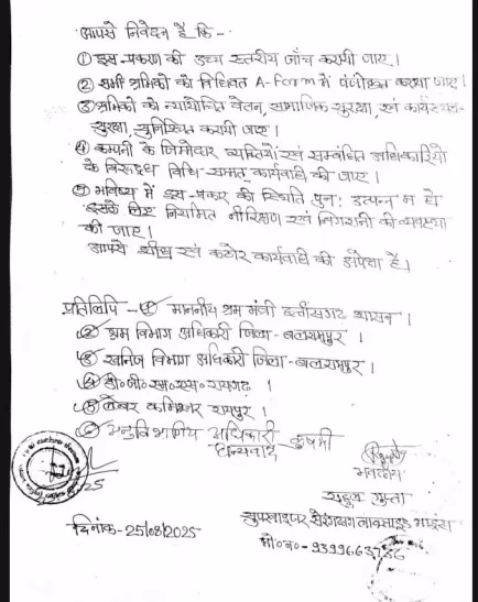 बलरामपुर में अवैध खनन व मजदूरों के शोषण का आरोप, बालाजी मार्बल एंड टाइल्स के खिलाफ कलेक्टर को ज्ञापन