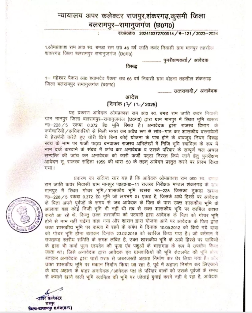 छत्तीसगढ़ के बलरामपुर–रामानुजगंज जिले से सामने आया यह मामला केवल एक ज़मीन विवाद नहीं, बल्कि उस पूरे सिस्टम का एक्स-रे है जहाँ राजनीतिक रसूख के आगे कानून वर्षों तक बंधक बना रहा। ग्राम मानपुर, तहसील शंकरगढ़ की जिस भूमि को राजस्व विभाग लंबे समय तक निजी बताता रहा, वह वास्तव में सरगुजा सेटलमेंट 1944–45 के अनुसार शासकीय गोचर (चरागाह) भूमि निकली।