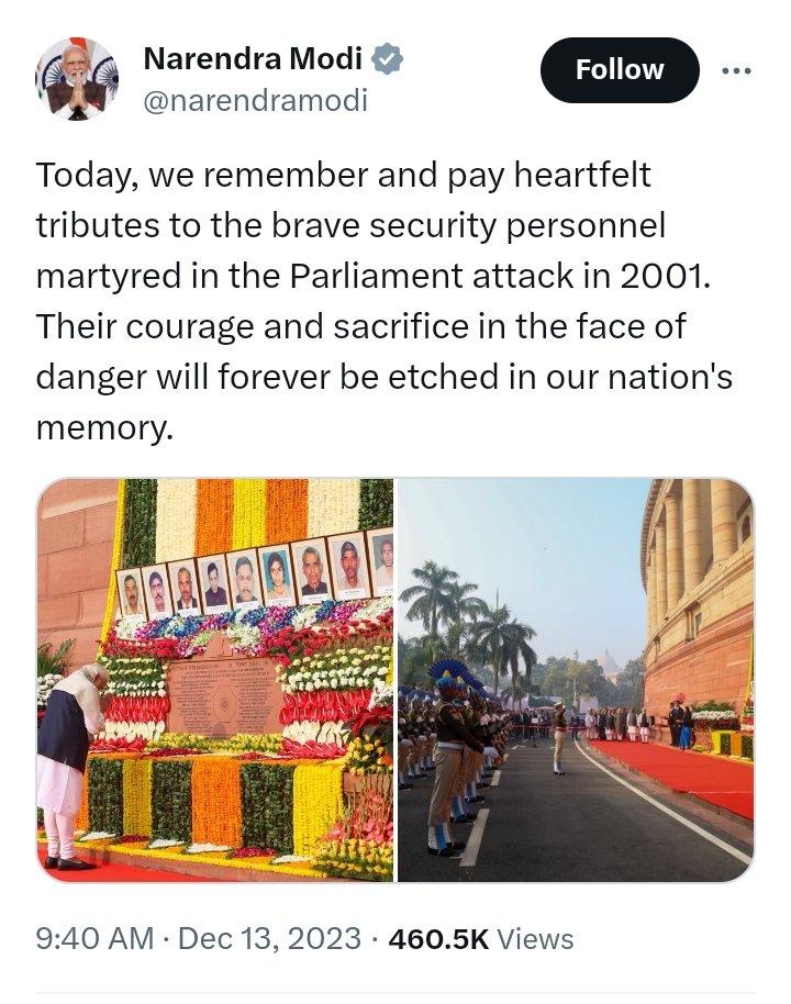 आज हम वर्ष 2001 में संसद हमले के दौरान शहीद हुए बहादुर सुरक्षाकर्मियों का स्‍मरण करते हैं और उन्हें भावभीनी श्रद्धांजलि अर्पित करते हैं। एक बड़े खतरे के सामने उनका साहस और बलिदान हमेशा हमारे देश की स्मृति में अंकित रहेगा।”